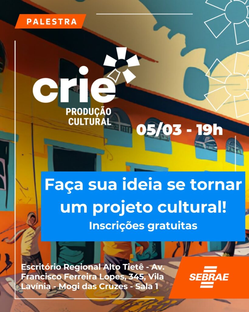 Encontro no dia 5 de março, em Mogi das Cruzes, orienta empreendedores criativos a estruturar propostas e anuncia nova oportunidade de capacitação. O Sebrae Alto Tietê promove, no dia 5 de março, das 19h às 21h, a palestra “Faça sua ideia se tornar um projeto cultural”, voltada a empreendedores, artistas e interessados em transformar talentos […]