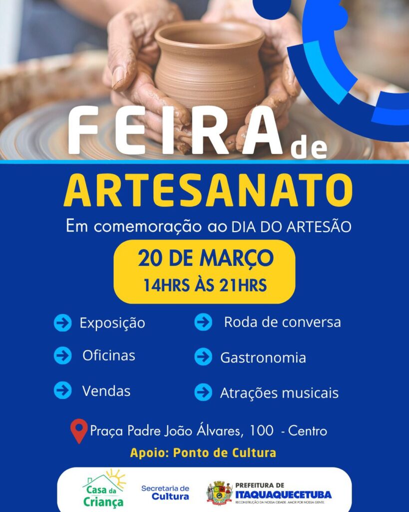 Secretaria de Cultura disponibiliza espaço gratuito para exposição e venda de produtos no dia 20 de março, no Centro A Secretaria de Cultura de Itaquaquecetuba realizará, no dia 20 de março de 2026, um evento especial em comemoração ao Dia do Artesão. A ação oferecerá, sem custos, espaço para exposição e comercialização de produtos artesanais […]